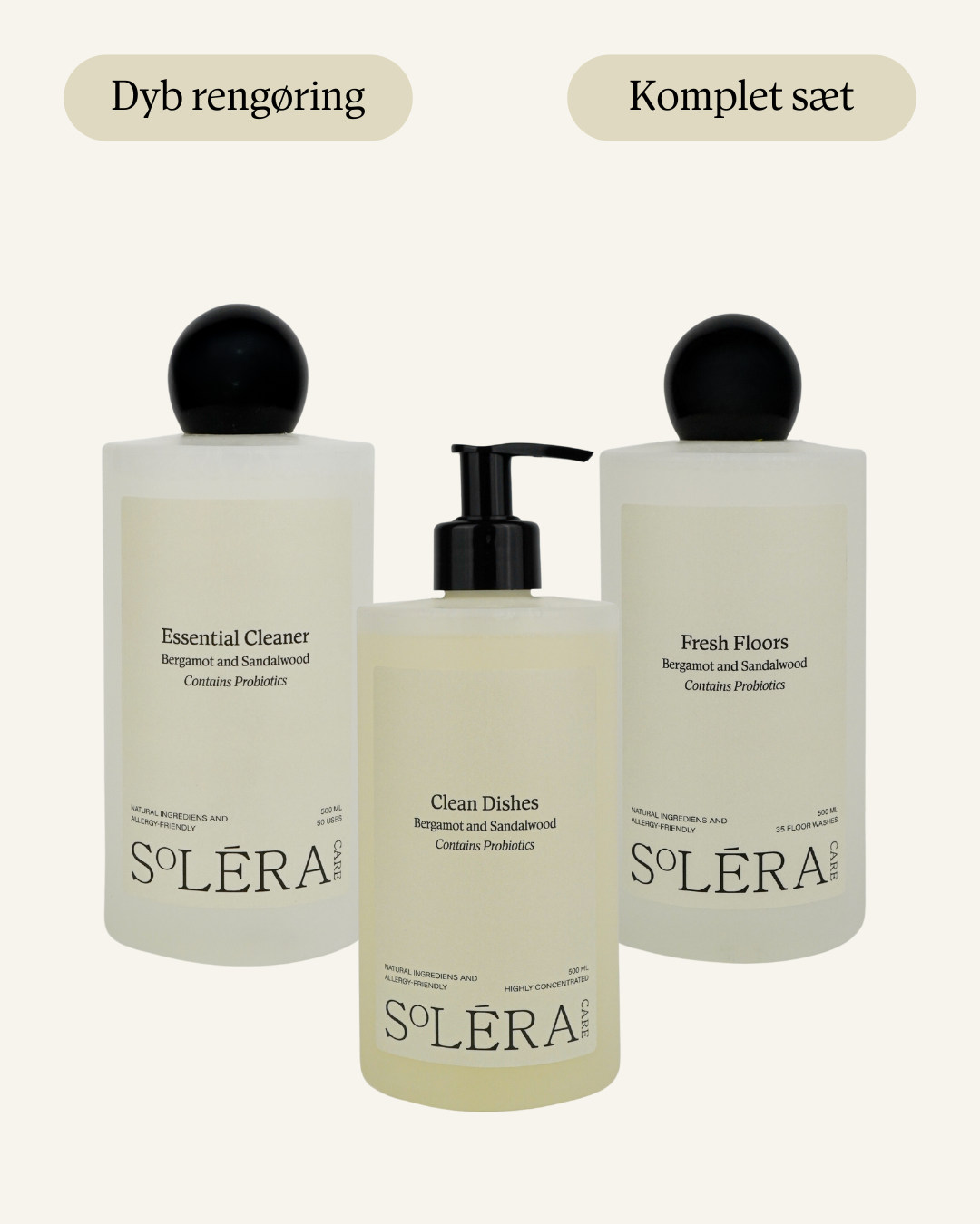 Dette sæt fuldender din rengøringsrutine med revolutionerende, dybdegående renhed. Soléra Care-produkterne er din naturlige løsning – baseret på levende probiotiske bakterier, der erstatter skrappe kemikalier. Vores produkter er fri for parabener, farvestoffer, hormonforstyrrende- og kræftfremkaldende stoffer.