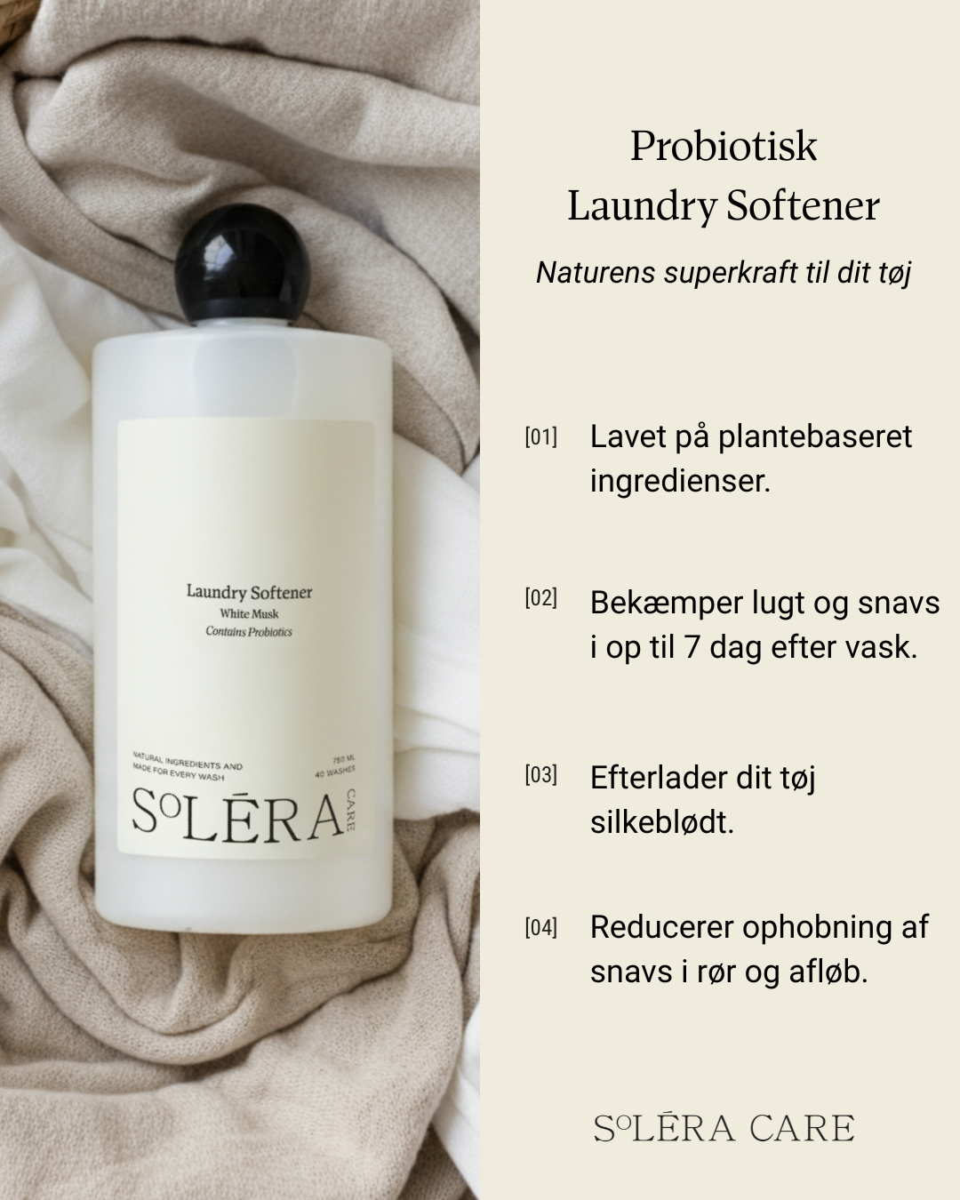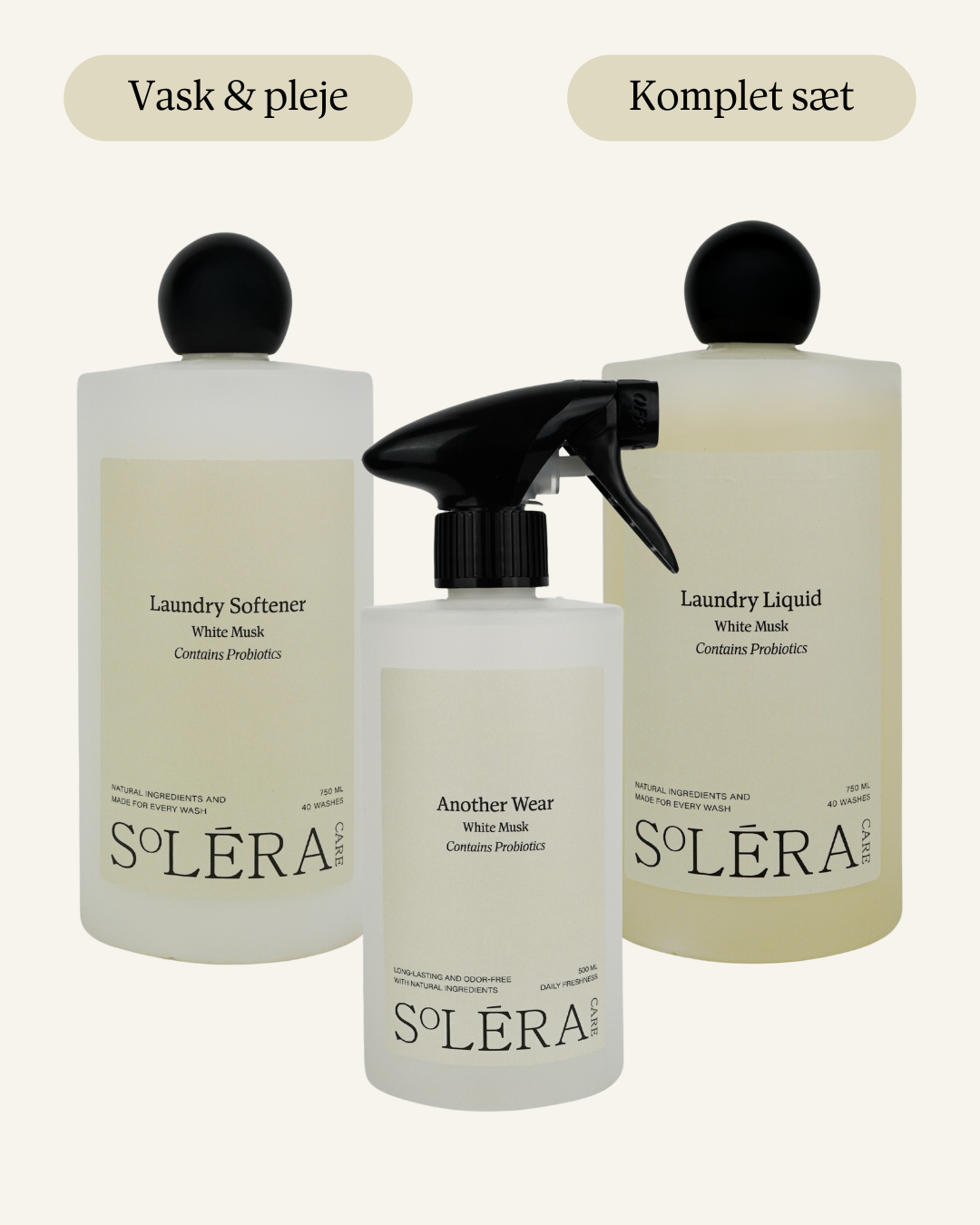 Fremtiden inden for tøjvask er her! Soléra Care kombinerer Laundry Liquid og Laundry Softener – et plejesæt baseret på naturlige, plantebaserede ingredienser og levende probiotika frem for skrappe kemikalier. Dette sikrer dit tøj en dybdegående renhed, en luksuriøs, silkeblød finish og den elegante duft af White Musk. Alle vores produkter er fri for parabener, farvestoffer, hormonforstyrrende- og kræftfremkaldende stoffer.