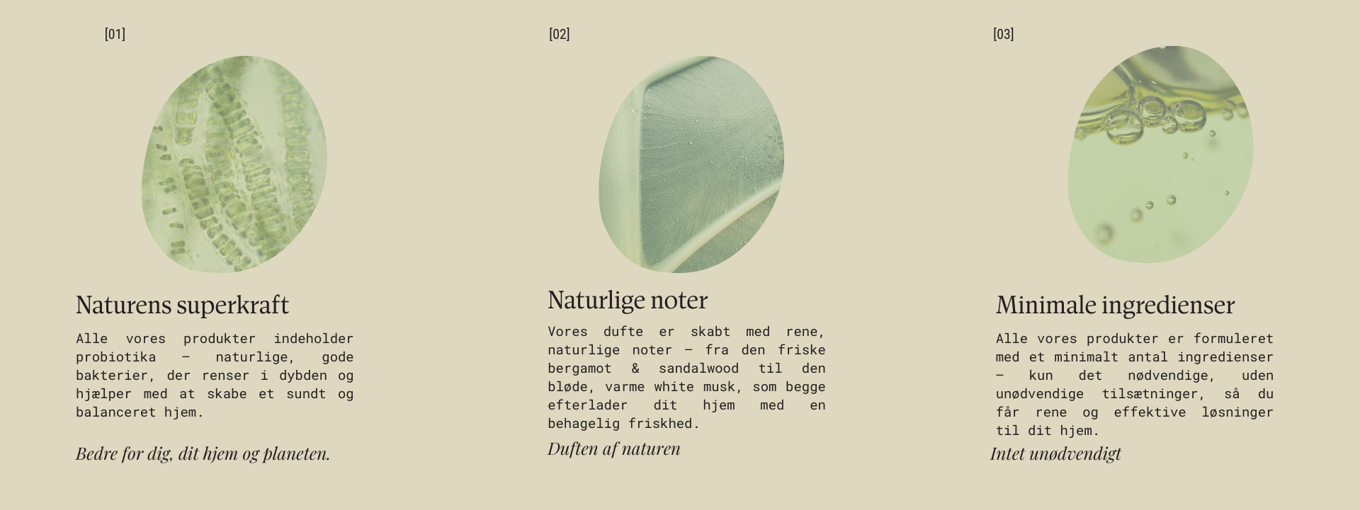 Alt er kemi, og derfor er vores produkter også kemi, selvom de er lavet af naturlige ingredienser. Vores produkter er udviklet uden skrap kemi, mikroplast eller unødvendige tilsætningsstoffer. Vi bruger naturlige, plantebaserede ingredienser kombineret med levende probiotika, hvilket vil sige at de er skånsomme for dig, dit hjem og bedre for planeten.